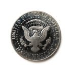 Reverse: Designed by Frank Gasparro, it showcases the Presidential Seal, an eagle with a shield and olive branches, surrounded by 50 stars. Inscriptions include “UNITED STATES OF AMERICA” and “HALF DOLLAR.”